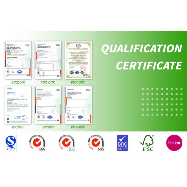 Certification : ISO22000:2018、ISO 9001:2015、ISO 14001:2015、ISO45001 、FSC-COC、BRC(A+)、Sedex